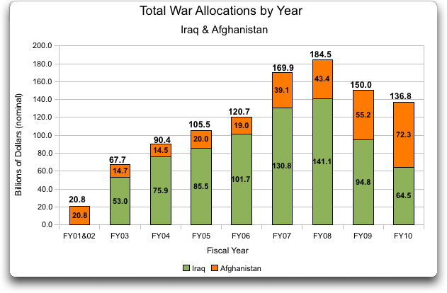 I was a little shocked last night to realize we’ve been at war almost a decade. I’ve often thought that the war was more about Dick Cheney’s pension from Halliburton than terrorism. Deborah White did an analysis on her blog about the costs of war. She claims: