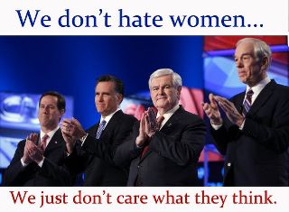 I was feeling intense angst over the Republican’s war on women when I took a good look at that photo of grumpy old men. I thought about Rush Limbaugh and realized that contraception will soon become a moot point if these guys’ views prevail. Julie said we’d need a court order compelling us to have sex. I think we’d all make like Madea and tell the judge “contempt of court for $1,000, Alex.” Alternatively, we’d be pounding on the doors of convents.