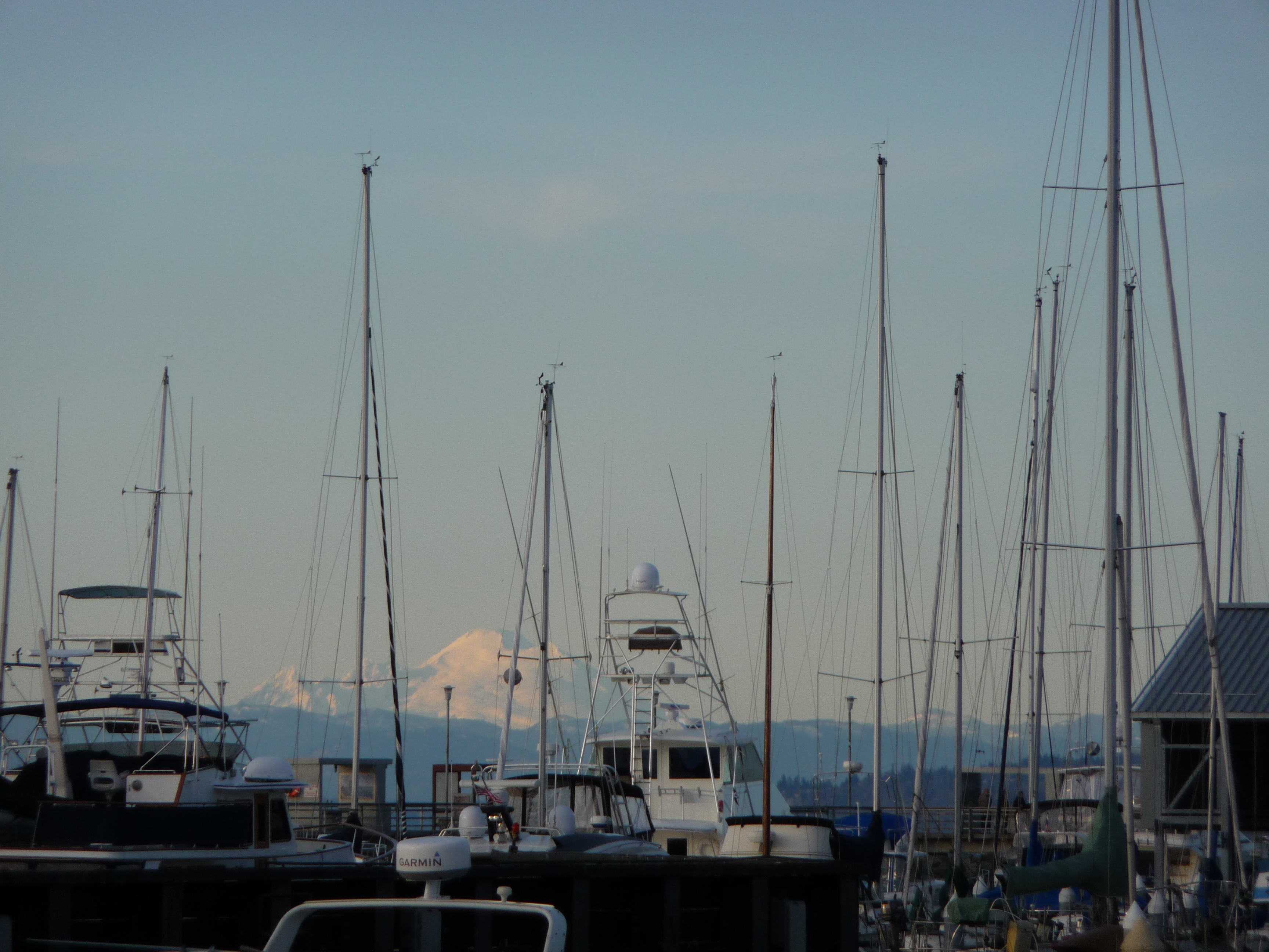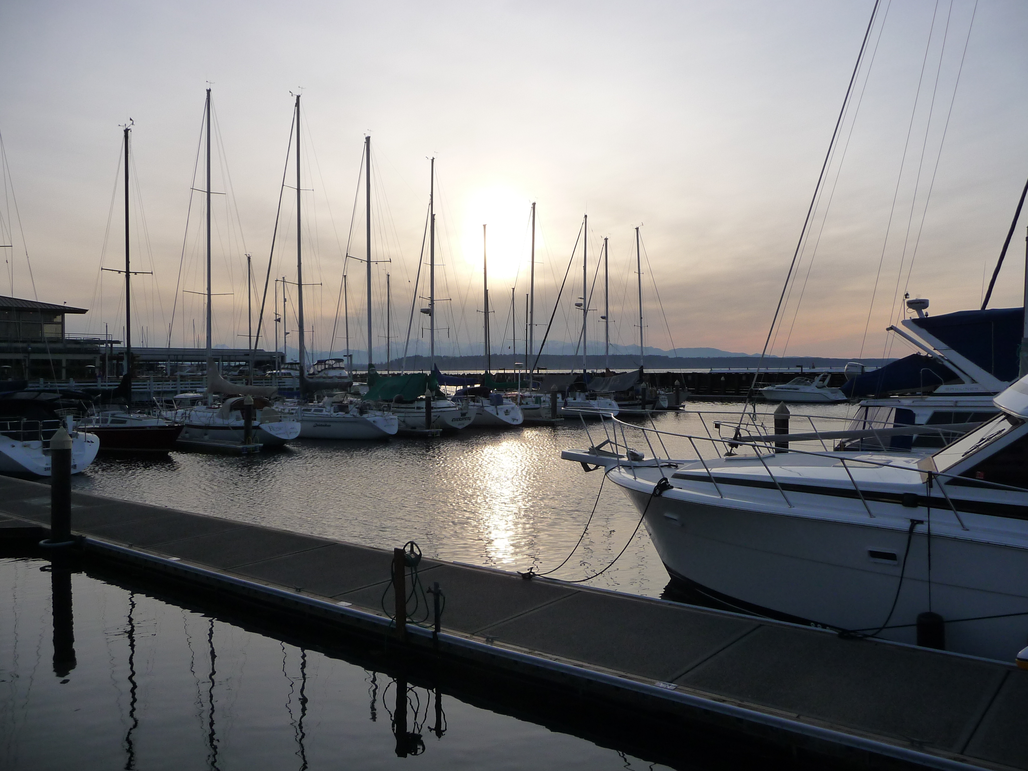 These photos were taken at sunset at the marina. The cloudy photo was taken at low tide, and the sunset photo is at high tide. The Olympic Mountains that you can see in the featured photo at the top of this post are obscured by clouds.