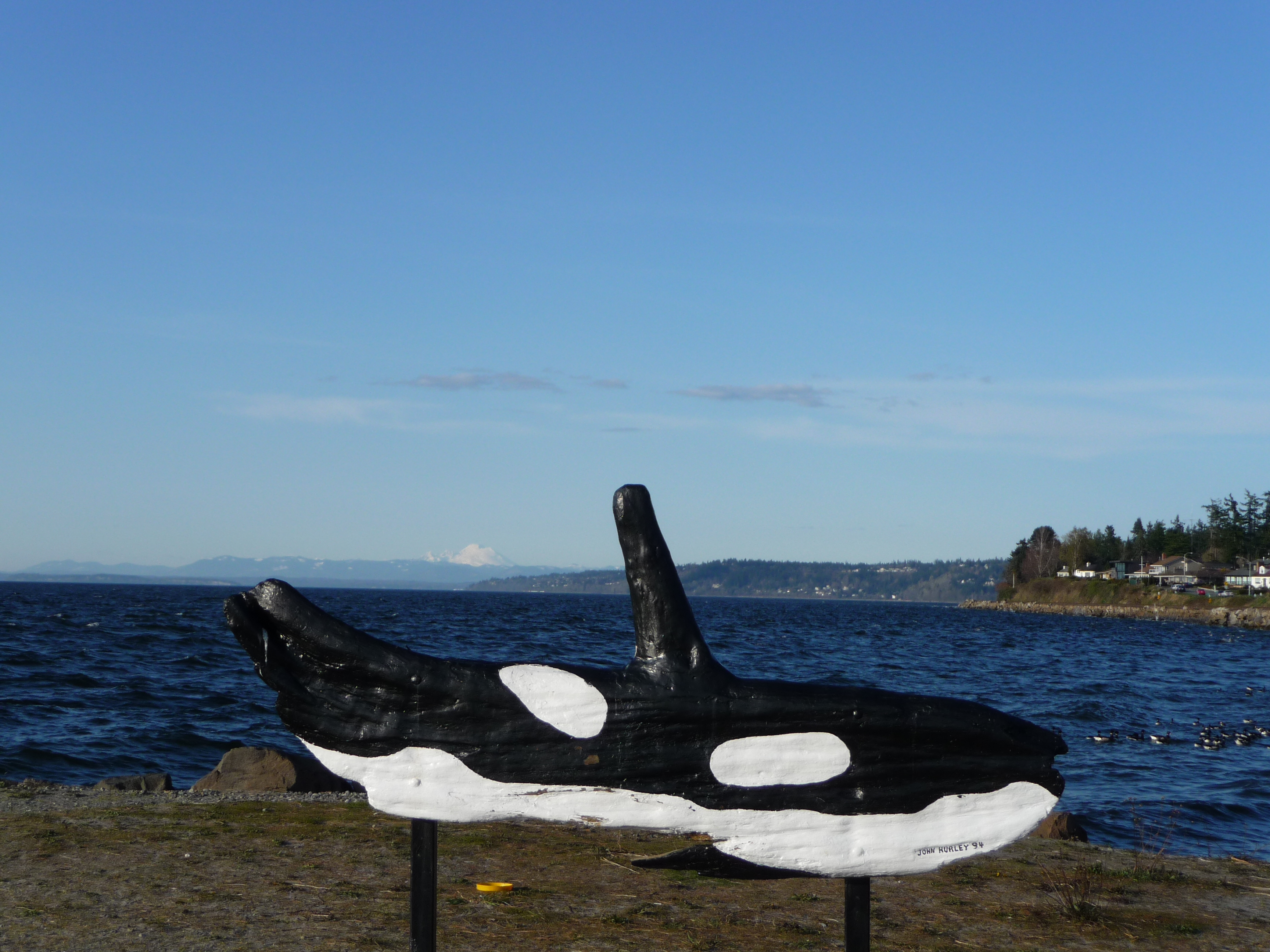 We’ve been blessed this Spring with a series of sunny weekends. There’s nothing like standing or sitting on the beach and seeing snow in the mountains where it belongs. The orca sculpture is at the underwater park north of the ferry dock. That’s Mt. Baker in the background.
