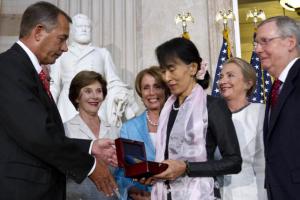 When I watched the news last night of Aung San Suu Kyi’s Congressional Gold Medal for her work for democracy in Myanmar, I was stunned to see politicians from both sides of the aisle unite in celebration of her work for peace. I wondered why they couldn’t all behave like grown-ups with great responsibility on behalf of We the People here in the United States. They bicker like brats on the playground for the benefit of their partisan followers and lobbyists, but I knew that last night they probably dined and drank together, told jokes, and enjoyed private camaraderie.