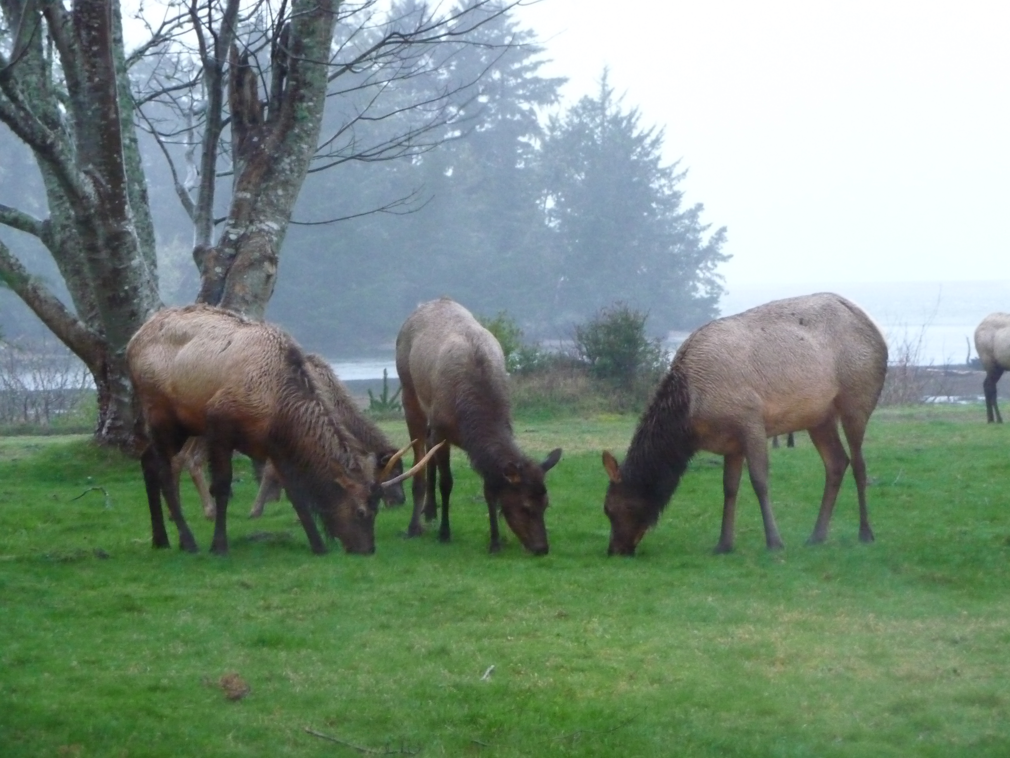 Daylight was fading, and we had a very long drive ahead of us. Our last stop was in Seaside where Shannon spotted a herd of elk grazing in a park. They are plentiful in Montana, but it was only the second time in my life that I’ve seen elk. I hope you can see the antlers on the elk at the center of the photo above.