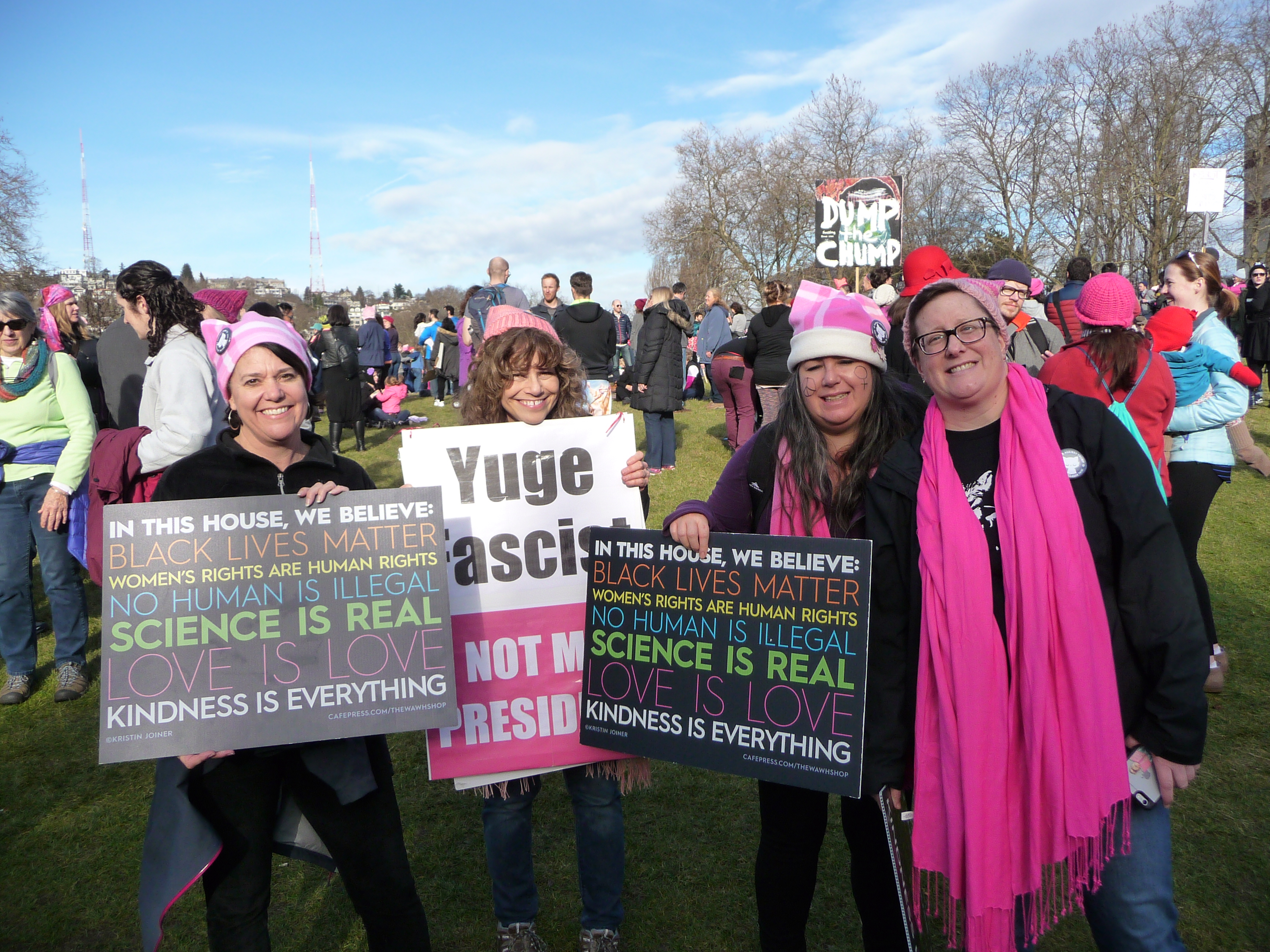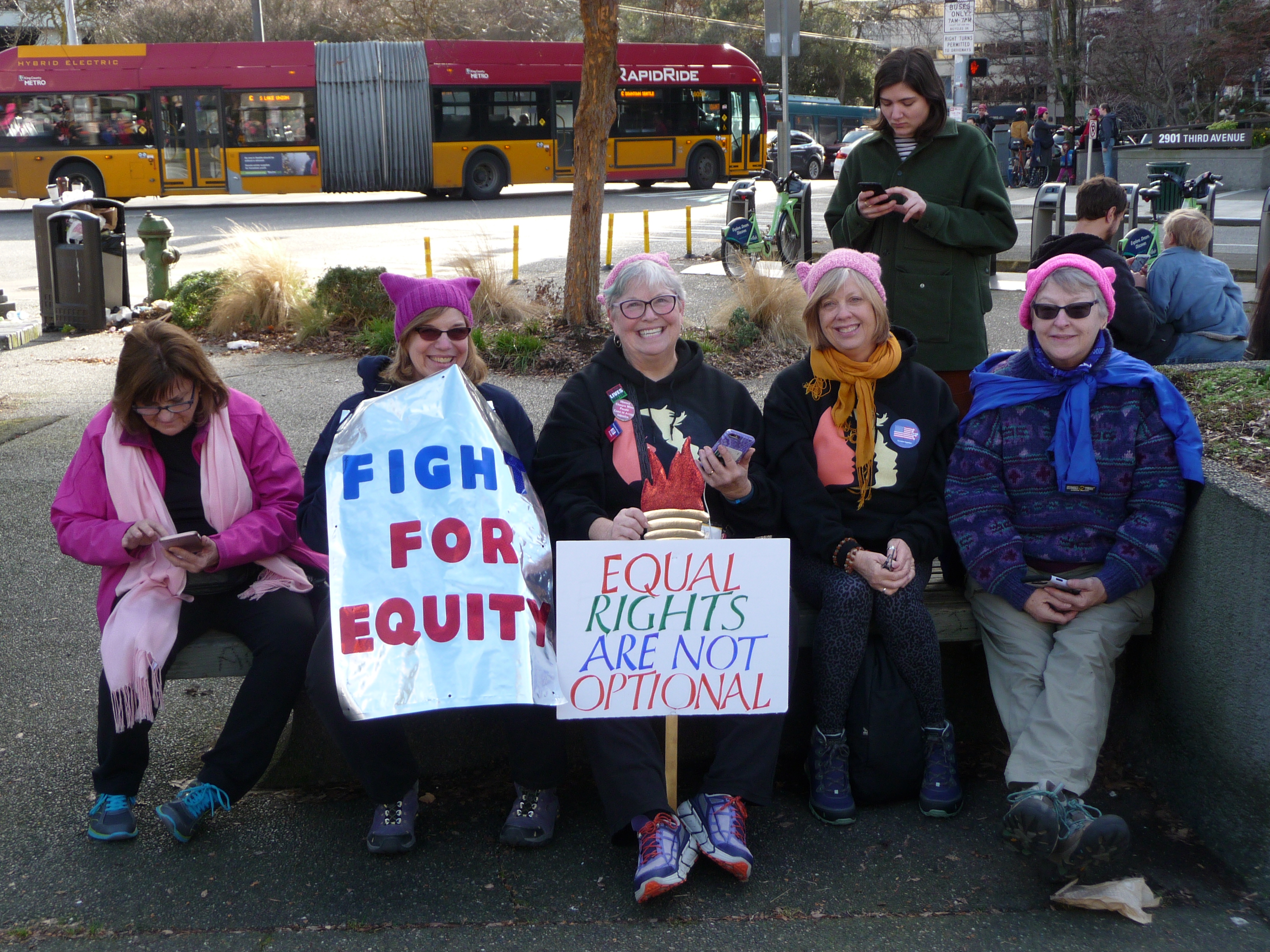 The fun started on the bus on the way to Seattle when I met up with a fellow PussyHat wearer. Everyone wanted a knitted PussyHat. The hat is essentially square in shape, and the corners become ears on your head. Clever, eh?